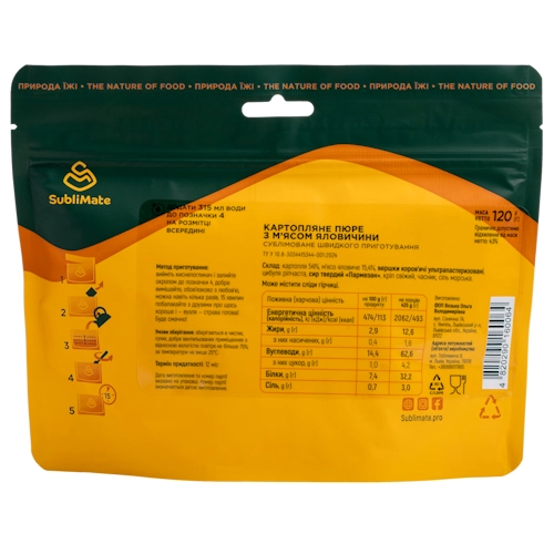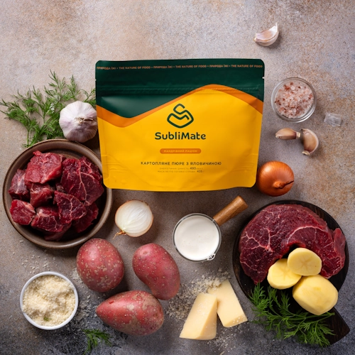Сублимированное картофельное пюре с говядиной SubliMate – это настоящий картофель с мясом, вдохновленный французской гастрономией. Картофель с мясом имеет неожиданно изысканный вкус благодаря сочетанию сливок и пармезана. Готовое блюдо проходит сублимацию, сохраняя каждый оттенок вкуса. Это не просто блюдо из мяса – это домашний вкус, идеально подходящий как еда в поход, для кемпинга или дальних странствий.