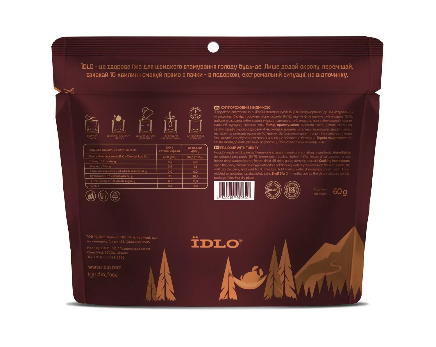 Состав: гороховое пюре сушеное (67%), филе индейки вареное сублимированное (15%), лук тушеный сублимированный, морковь тушеная сублимированная, укроп сублимированный, чеснок сушеный, куркума, морская соль.