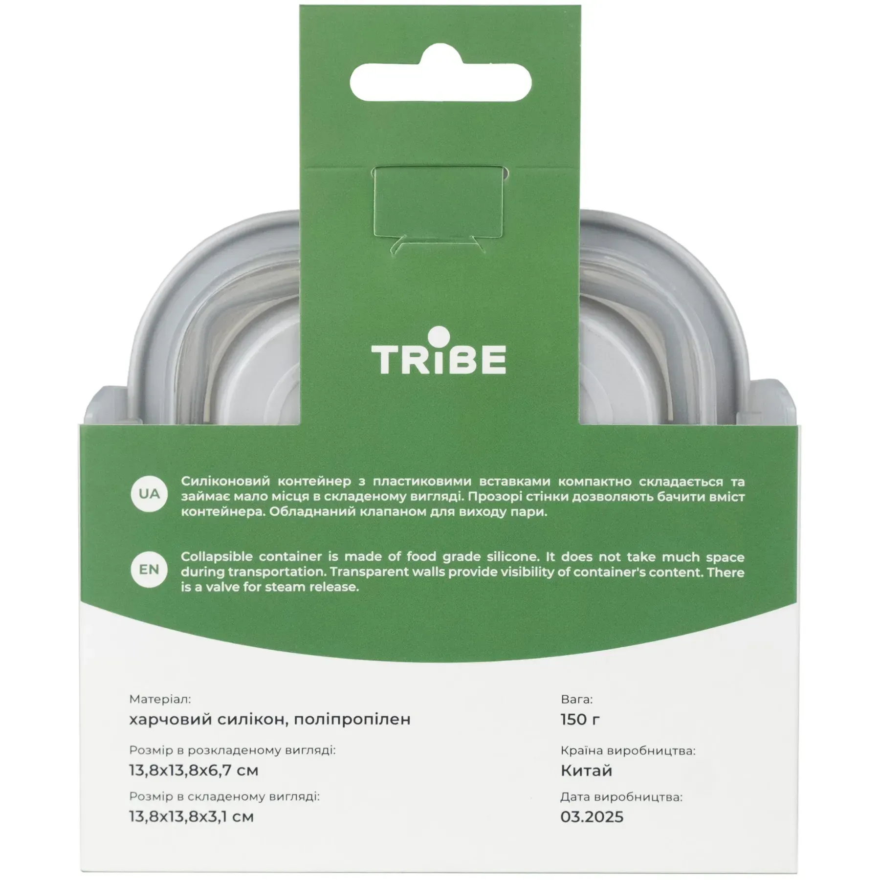 Tribe Collapsible Container 500 мл это складной пищевой контейнер квадратной формы, изготовленный из безопасного для пищи силикона с жесткими пластиковыми вставками. В разложенном состоянии обеспечивает удобный объем для перекусов, соусов или гарниров, а после использования доли секунды складывается до плоского профиля, экономя место в рюкзаке или шкафу. Прозрачные стенки позволяют видеть содержимое без открывания, а крышка с клапаном выпуска пара предотвращает конденсат при переноске только что подогретой пищи. Конструкция продумана для ежедневного ритма: контейнер совместим с горячими и холодными блюдами, подходит для разогрева и мытья в посудомоечной машине, легко очищается и служит долго.