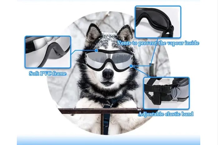 На великих висотах сонце стає агресивнішим і снігові поля можуть засліплювати не тільки вас, а й хвостатого. Спеціалізовані сонцезахисні окуляри/маски для собак убезпечать очі від УФ-випромінювання і снігових віддзеркалень, а також від потрапляння дрібного каміння і піску, які можуть летіти від вітру. Не забувайте і про себе, в обов'язковому порядку, беріть тільки якісні захисні лінзи.